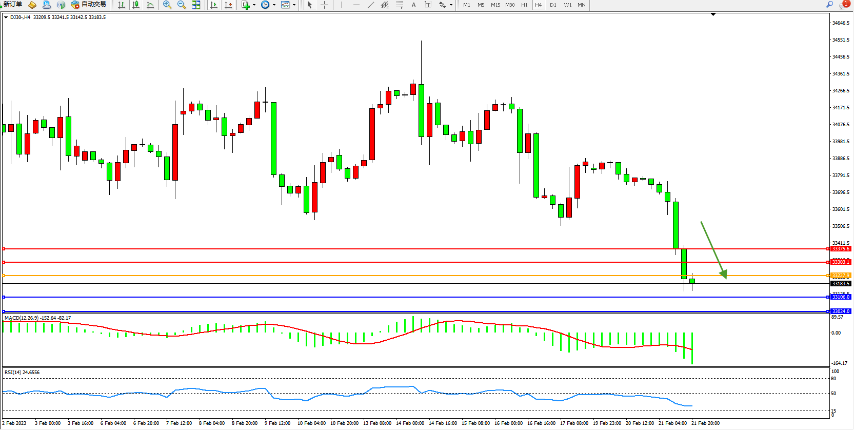 交易策略:33227下方看跌,目标33106、33024