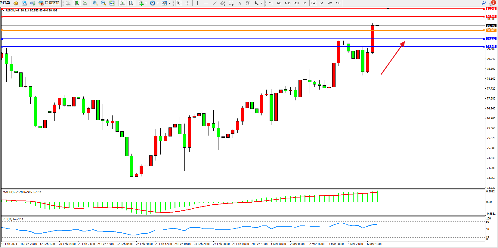 原油USOil——4小时K线图显示:
