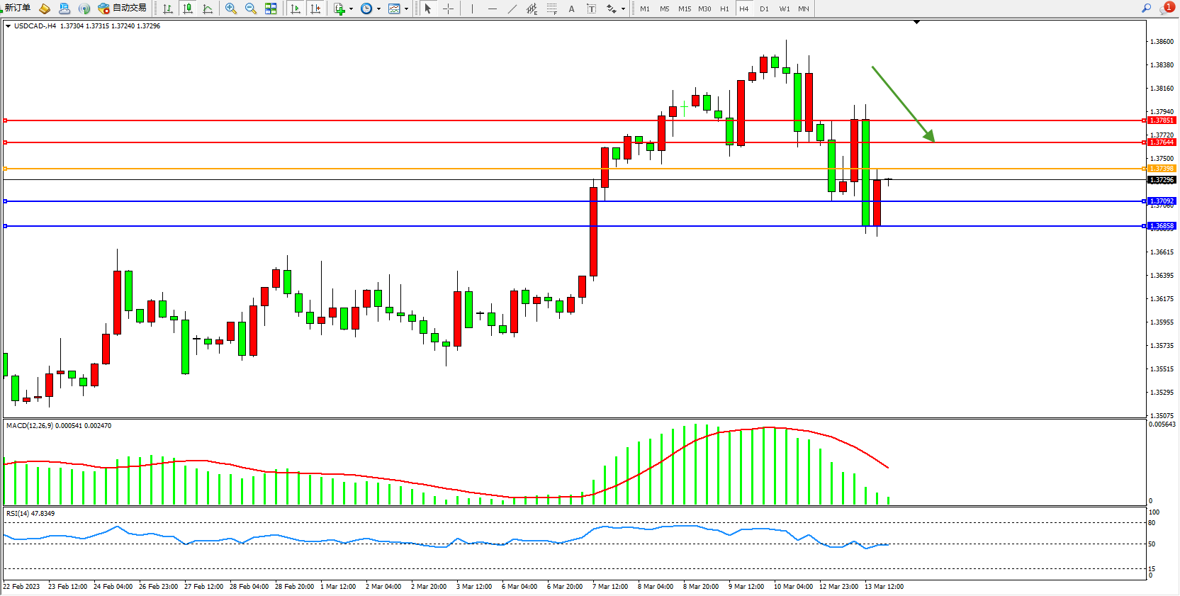 美元加元USDCAD——4小时K线图显示: