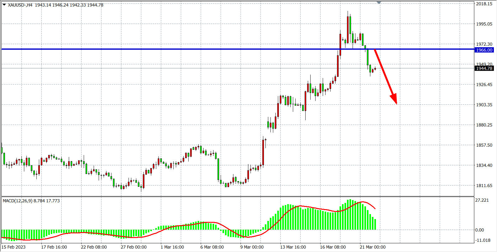 4小时图看,现货黄金再度延续跌,跌破1966支撑后顶部形成,价格进一步回落,MACD在零轴上开始缩量,支撑1966转化为阻力位,日内1966之下看1920-1900附近。