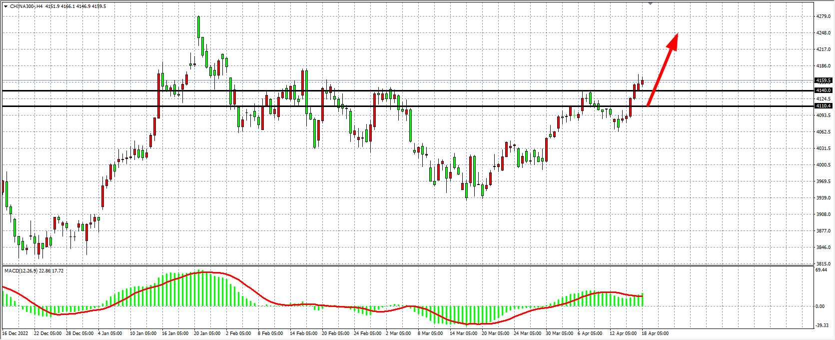 4小时图看,沪深300进一步走高突破4140,MACD量能在零轴之上重新走高,支撑关注4110-4140区域,逢低看涨,上方目标4200-4250附近。