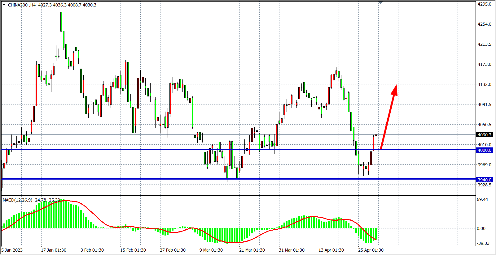 4小时图看,沪深300在3940之上进一步走高,MACD量能在零轴下开始缩窄,探底回升明显,关注4000点附近支撑,上方目标看4080-4140。