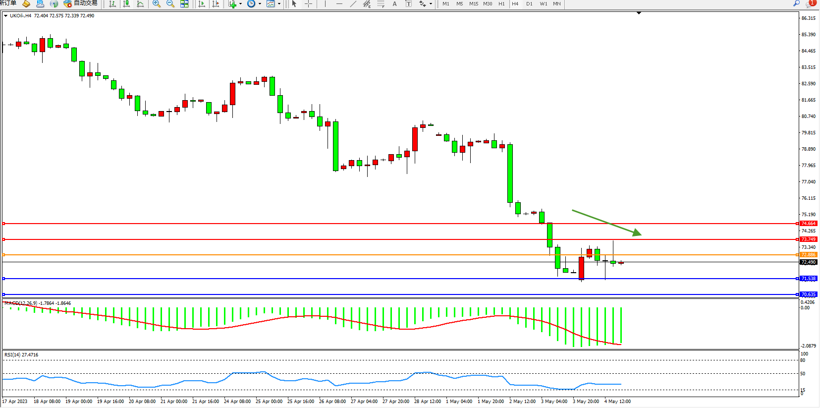 交易策略:72.886下方看跌,目标71.538 70.635