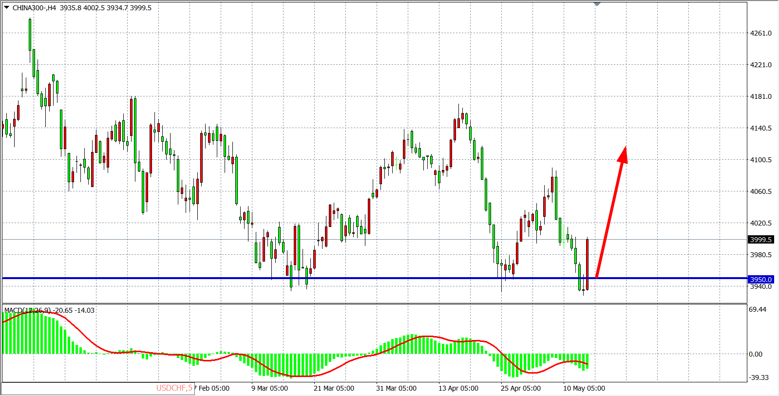 4小时图看,沪深300先跌后涨出现“V字”反弹,守在3900关口之上,MACD量能在零轴下开始缩量,行情存在筑底反攻机会,当前支撑关注3950一线,该位之上看涨,目标4050-4100附近。