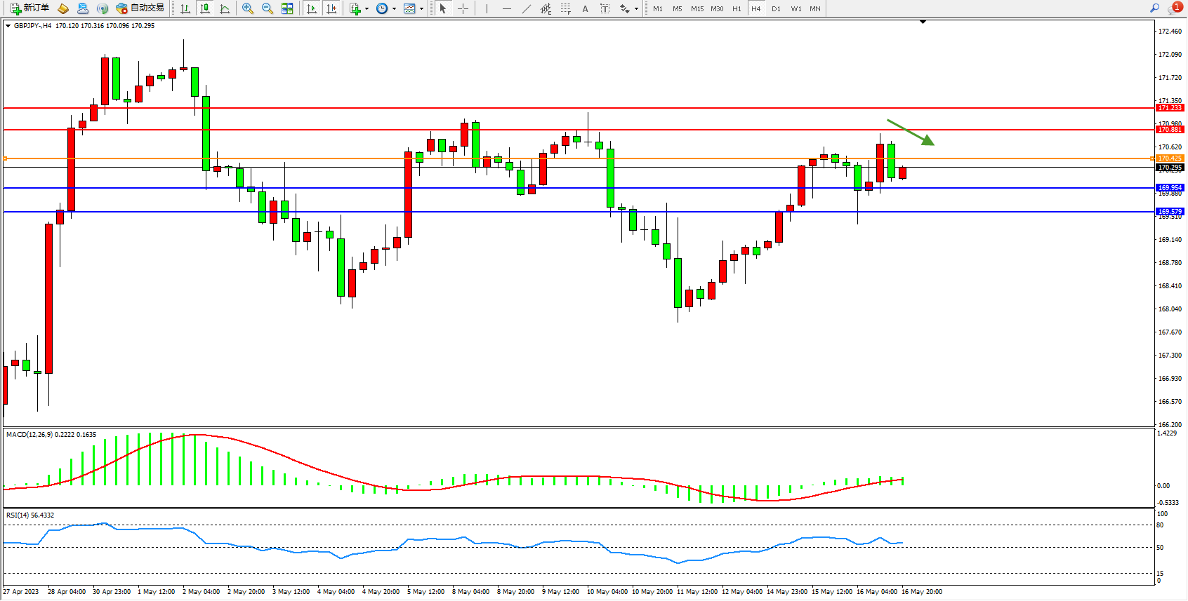 交易策略:170.425下方看跌,目标169.954  169.579