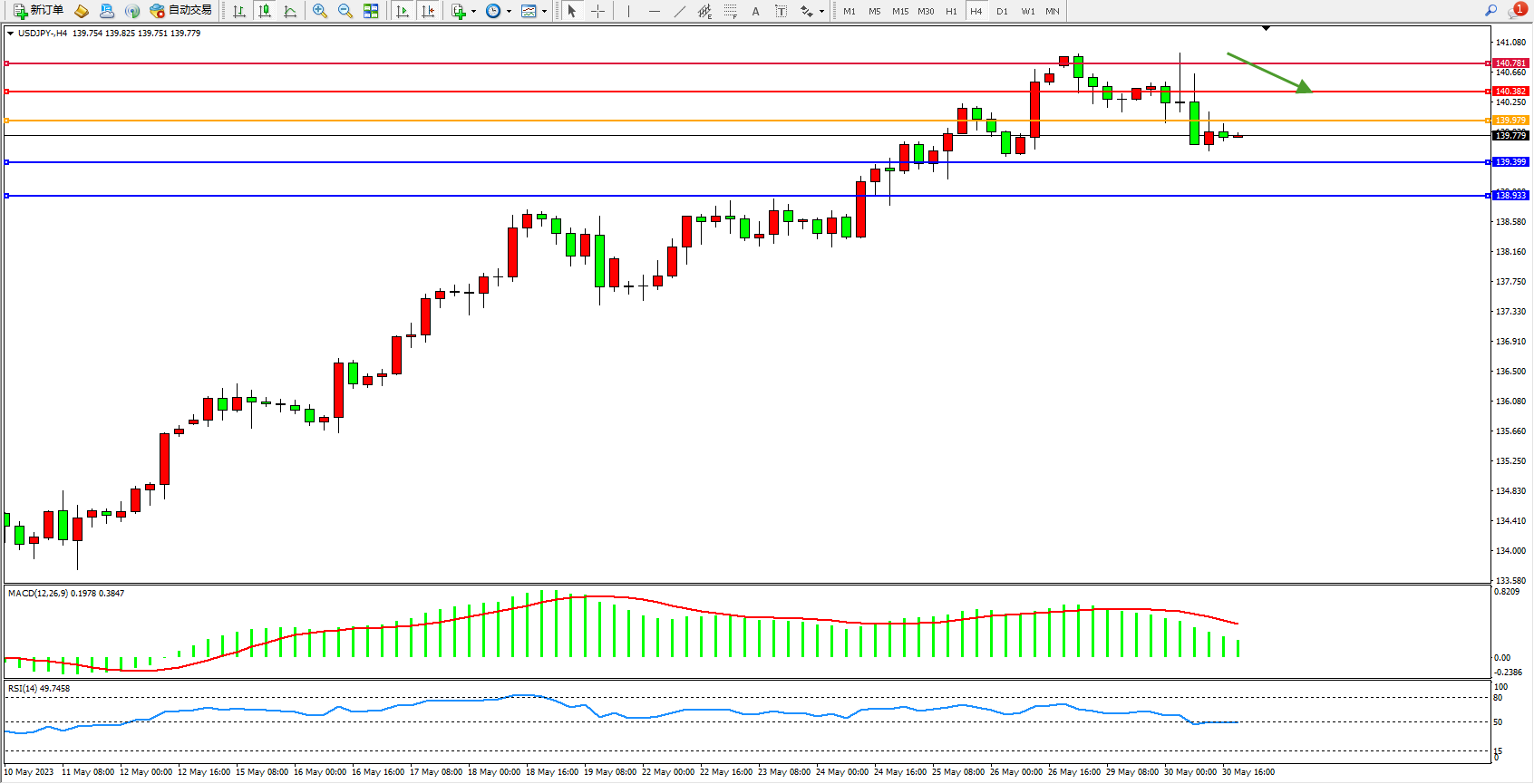 交易策略:139.979下方看跌,目标139.399 138.933