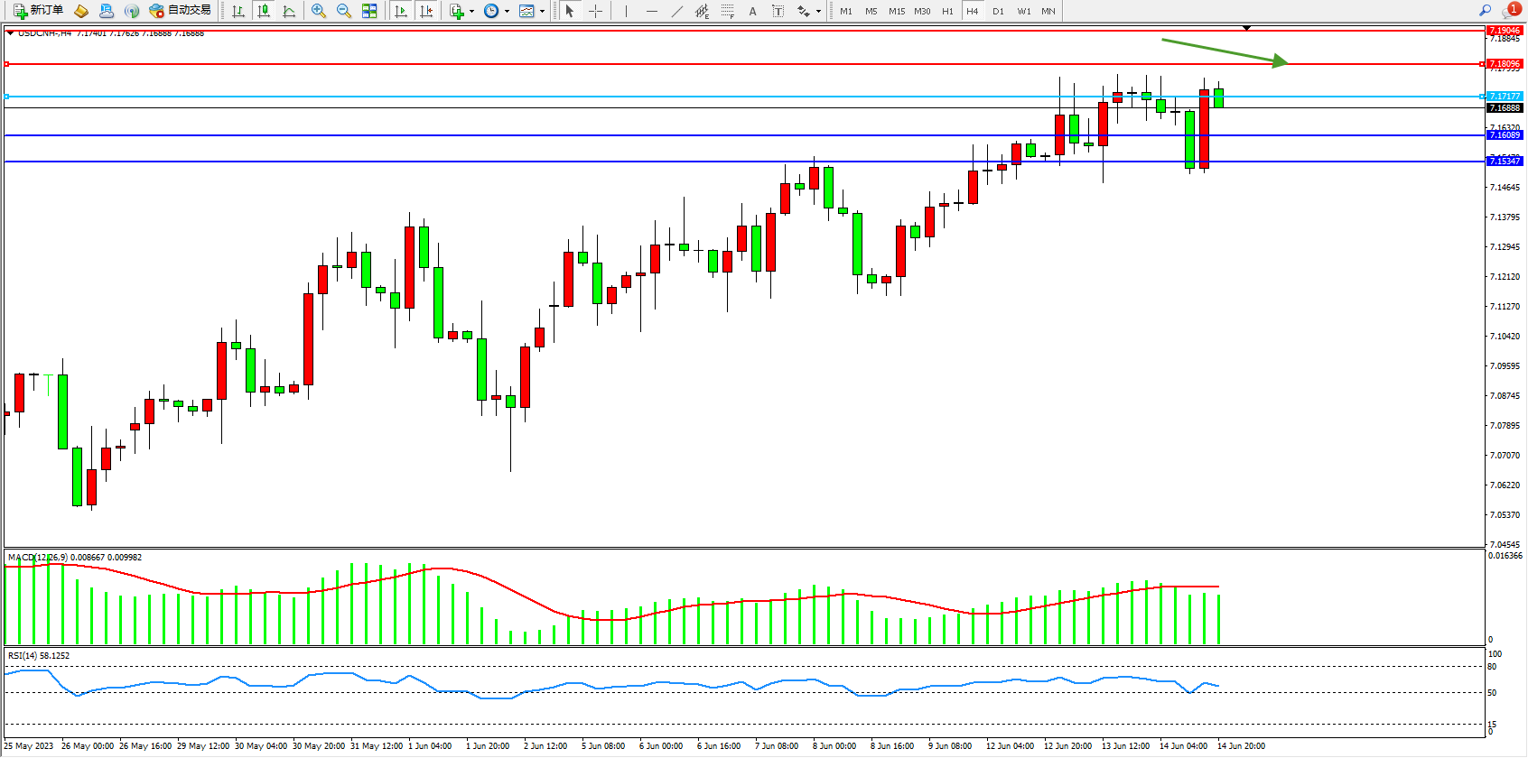 美元人民币USDCNH——4小时K线图显示: