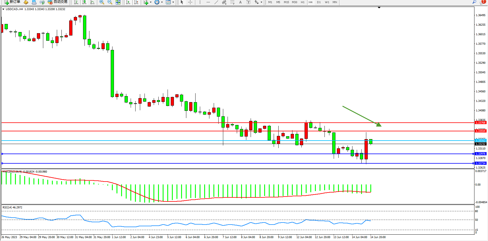美元加元USDCAD——4小时K线图显示: