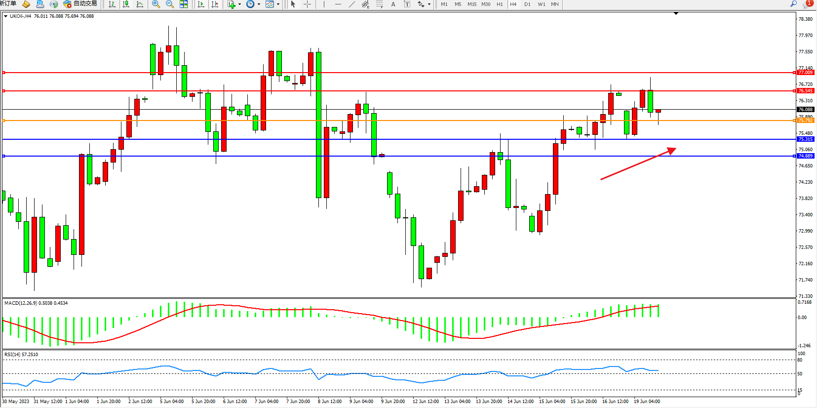 交易策略:75.792上方看涨,目标76.545  77.009