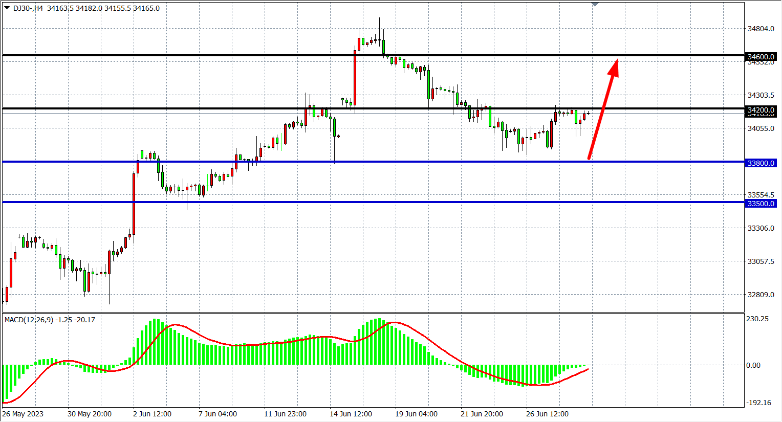 4小时图看,道指继续围绕在34200附近盘整,MACD量能在零轴下缩量即将上穿零轴,短期反弹行情开启,下方支撑33800-33500,上方关注34200,上破可进一步看至34600-35000。