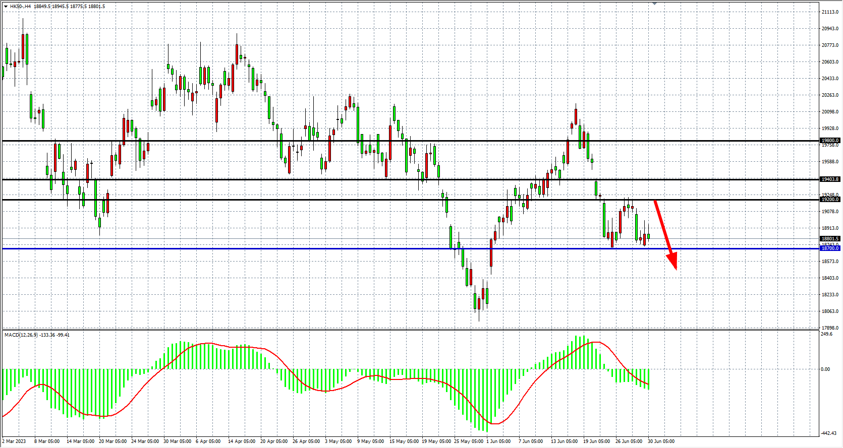 4小时图看,恒指在18700点上维持盘整,MACD量能维持在零轴之下放大,趋势回归下跌,支撑关注18700-18300,压力19200-19500。