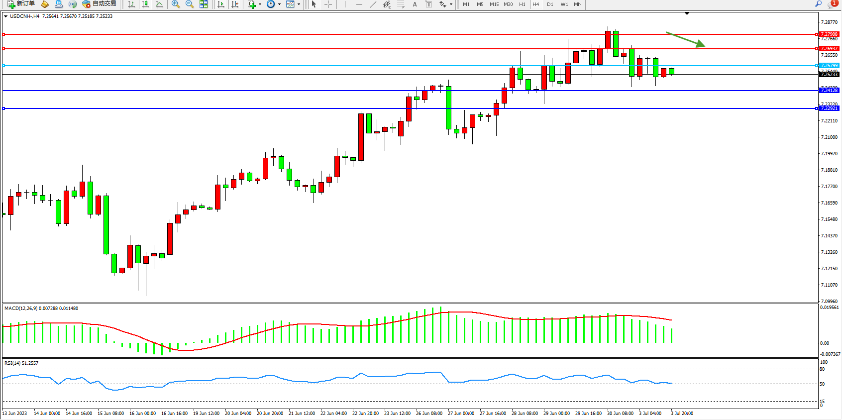 备选策略:7.25799上方看涨,目标7.26937  7.27908