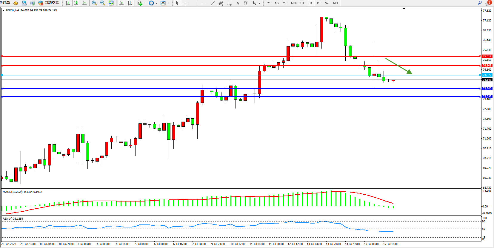 交易策略:74.145下方看跌,目标73.700 73.297