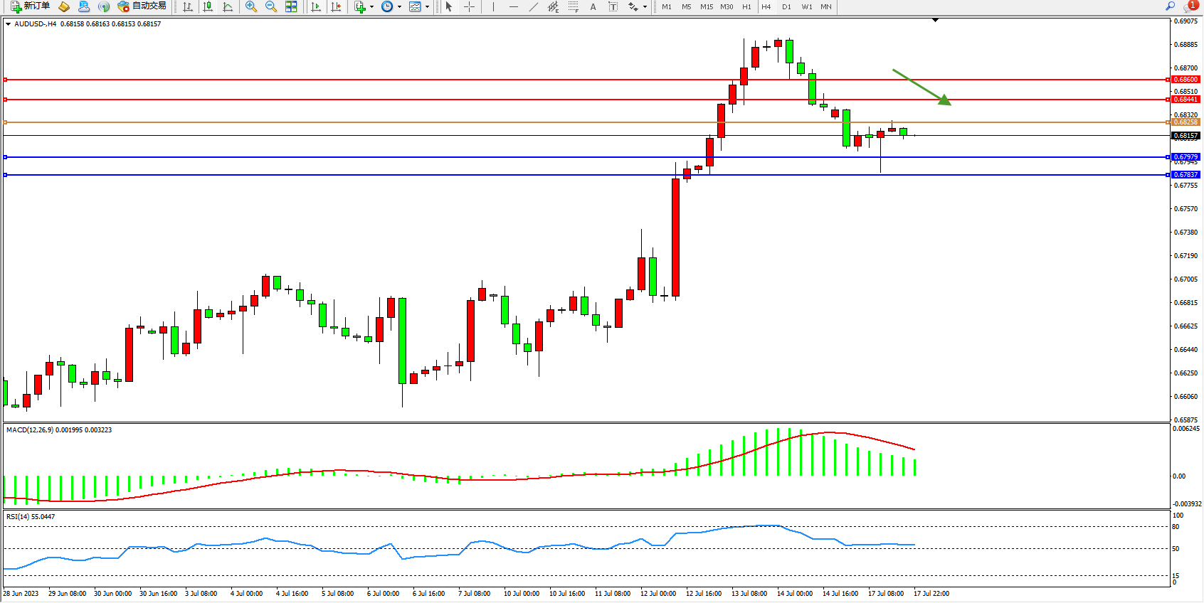 阻力位:0.68441 0.68600