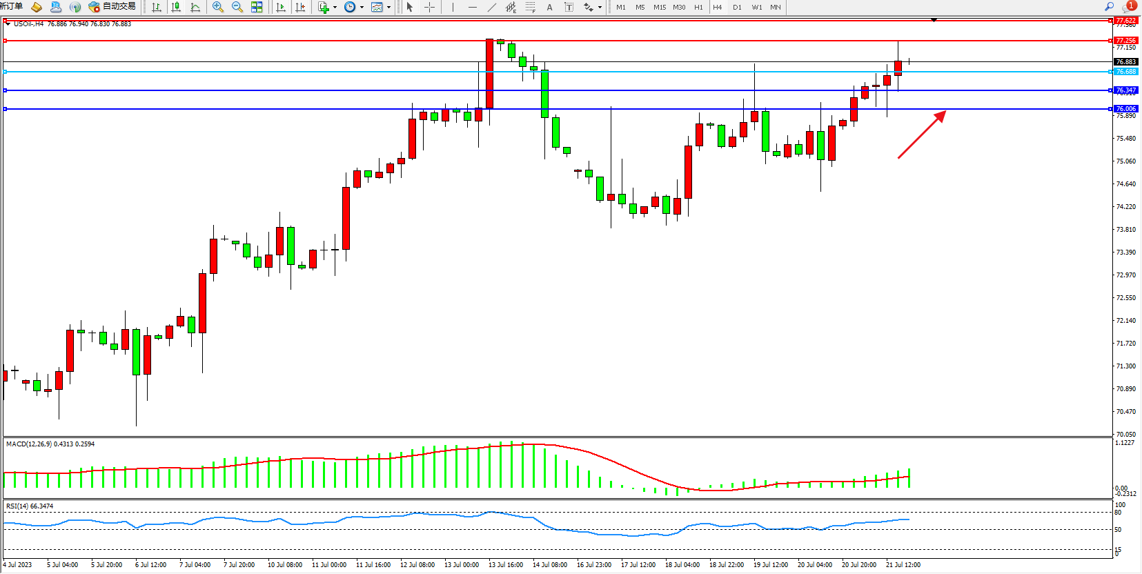 交易策略:76.688上方看涨,目标77.256 77.622