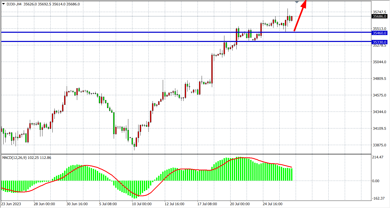 4小时图看,道指维持在35500之上运行,MACD量能维持零轴上放量,多头趋势强劲,支撑关注35460-35330附近,阻力36000。