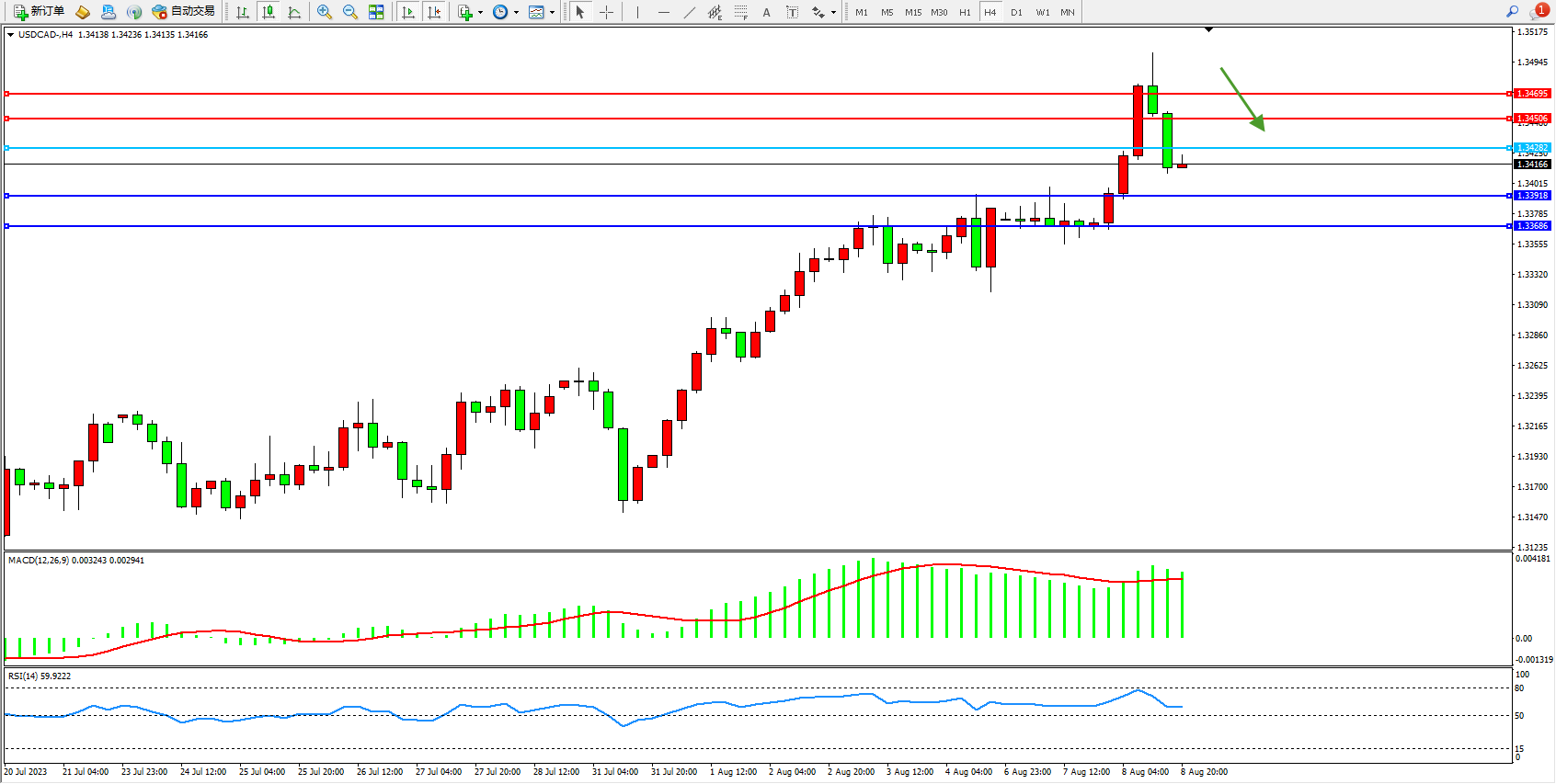 美元加元USDCAD——4小时K线图显示: