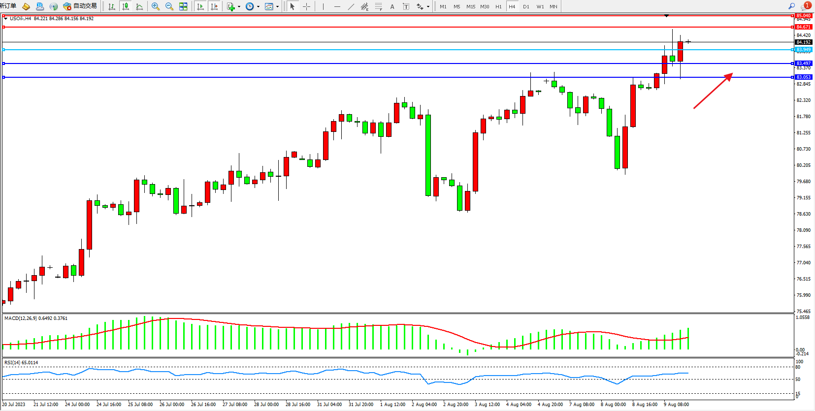 原油USOil——4小时K线图显示: