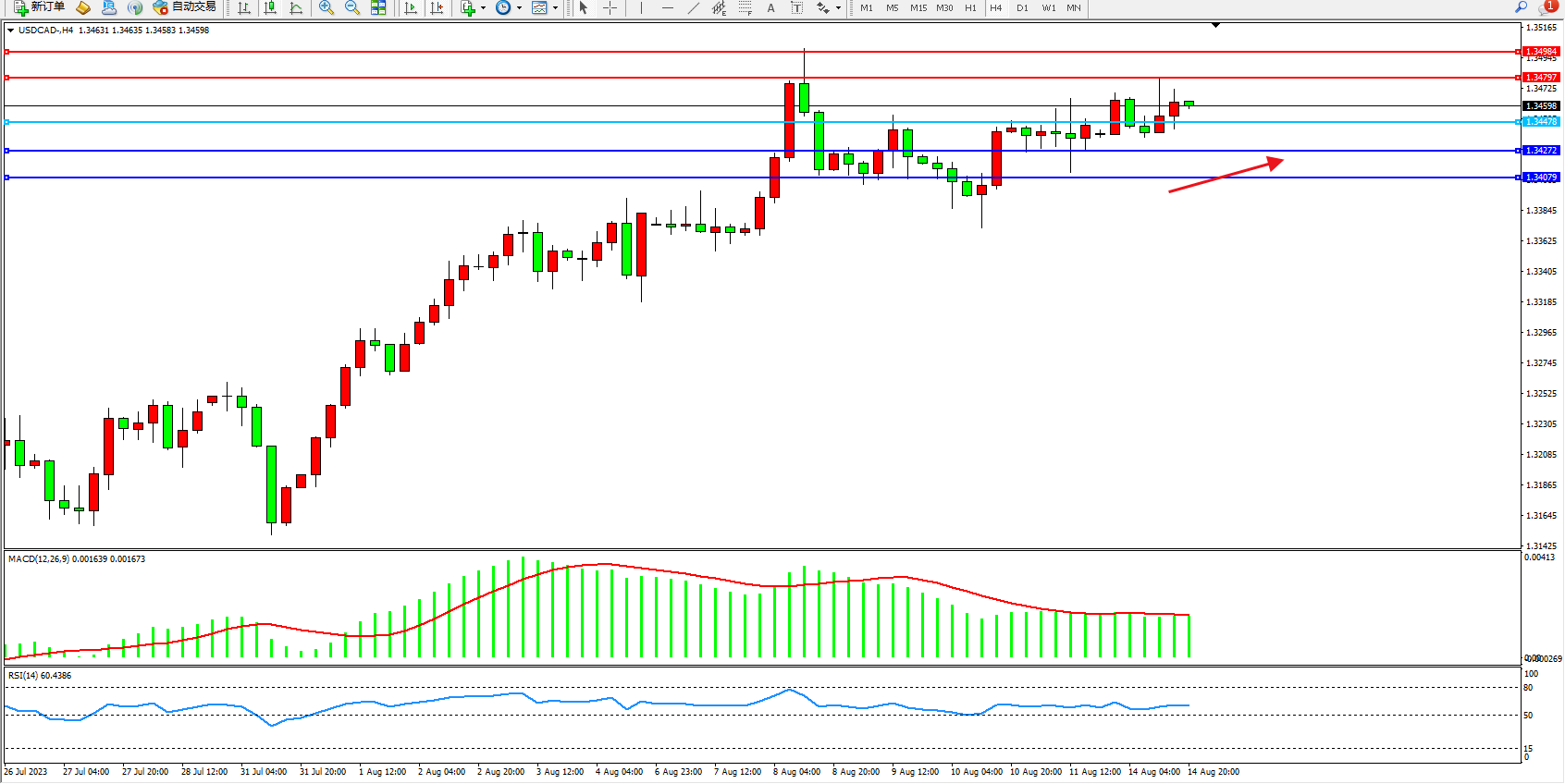 美元加元USDCAD——4小时K线图显示: