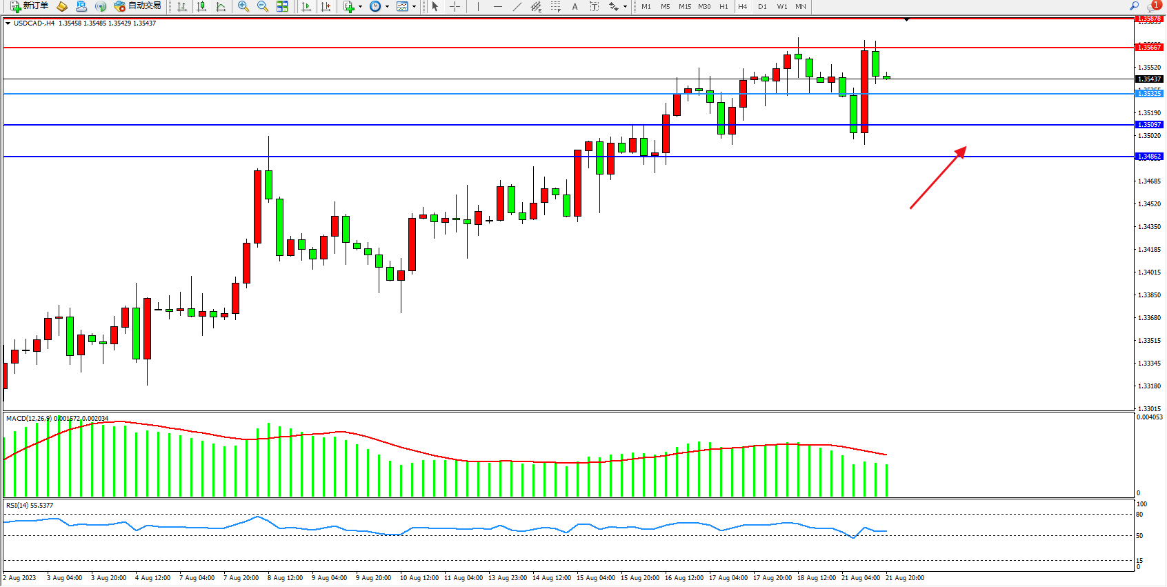 美元加元USDCAD——4小时K线图显示: