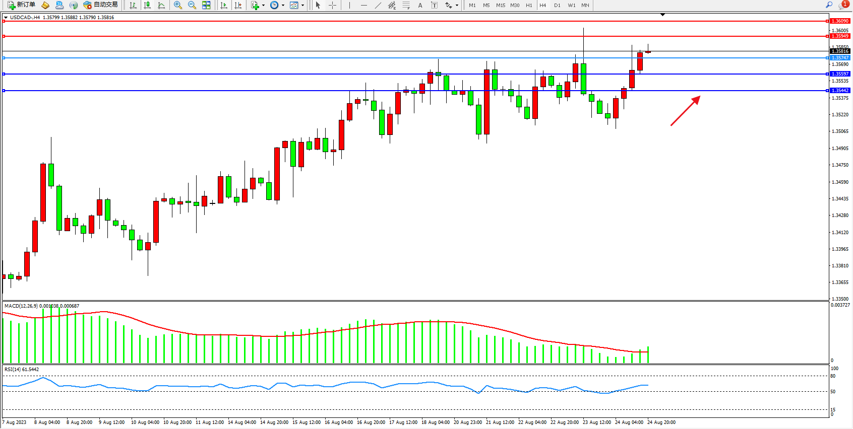 美元加元USDCAD——4小时K线图显示: