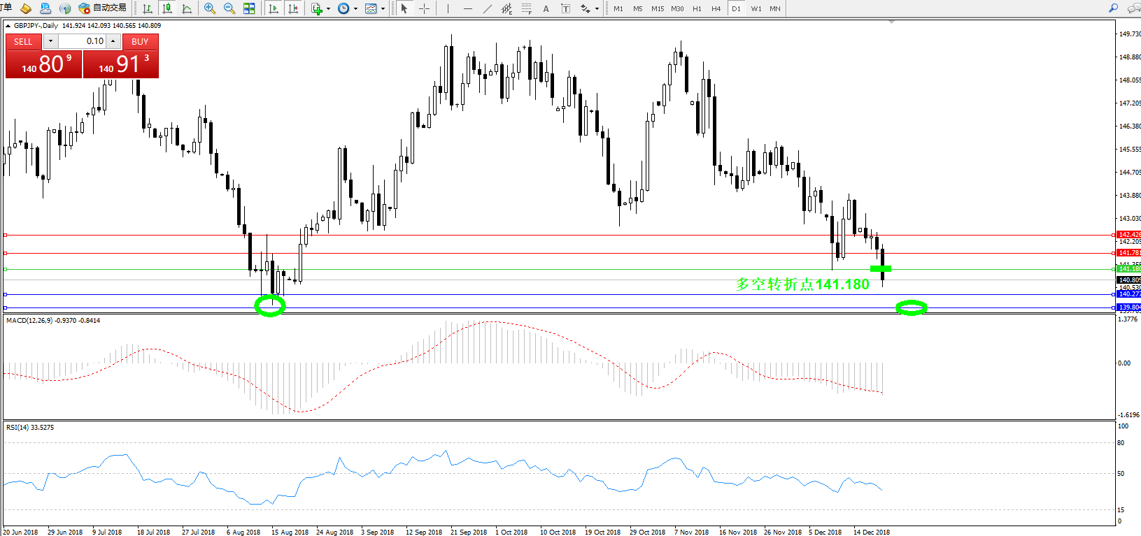 交易策略:141.180下方看跌,目标140.272139.804