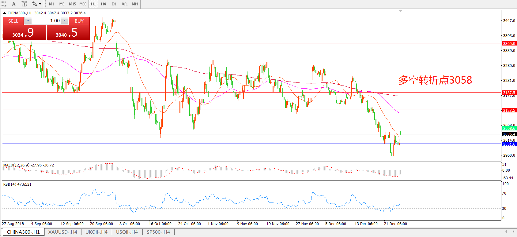 1小时图看,CHINA300中华指数虽触及3000支撑附近有所反弹,但整体走势依旧偏弱,均线系统呈空头排列, MACD绿柱增加,RSI持有拐头迹象,短线依然看空