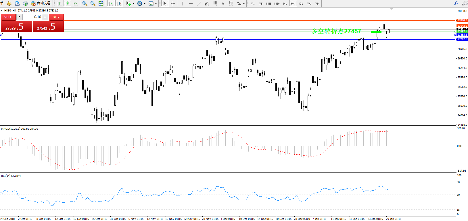 交易策略:27457上方看涨,目标27642、27818