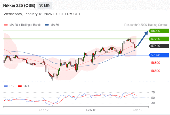 在 57090 之上,看涨,目标价位为 57700 ,然后为 58000 。
