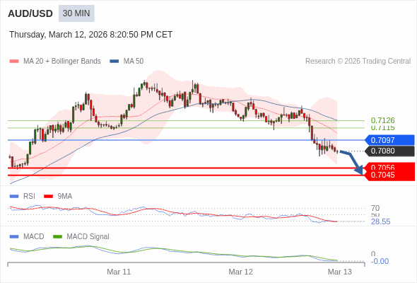 澳元/美元 当日内 : 看跌,在 0.7097 之下。
