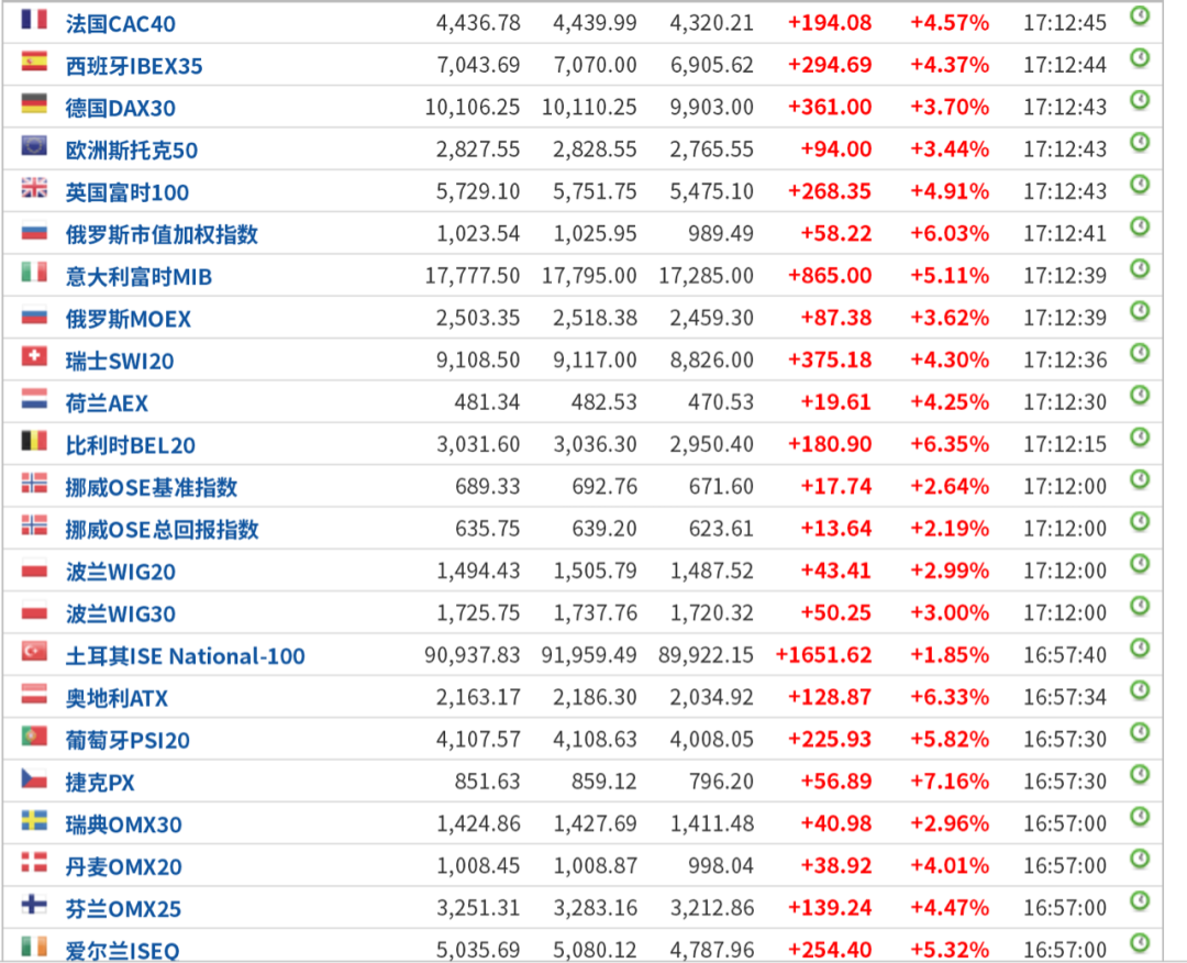 一个小时后,欧洲股市涨幅扩大,德国DAX指数、法国CAC40指数均涨超4%,英国富时100指数涨近5%。意大利、捷克、比利时、奥地利等欧洲国家股市涨幅均超6%以上。