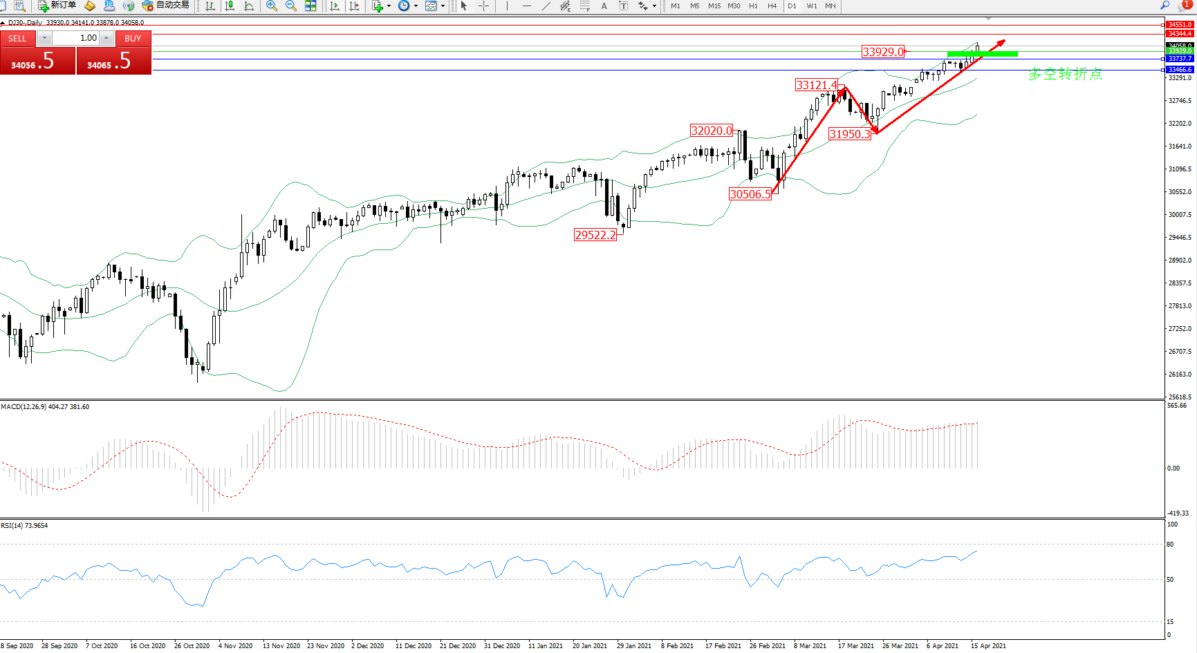 道琼斯指数DJ30—— 日K线图显示:
