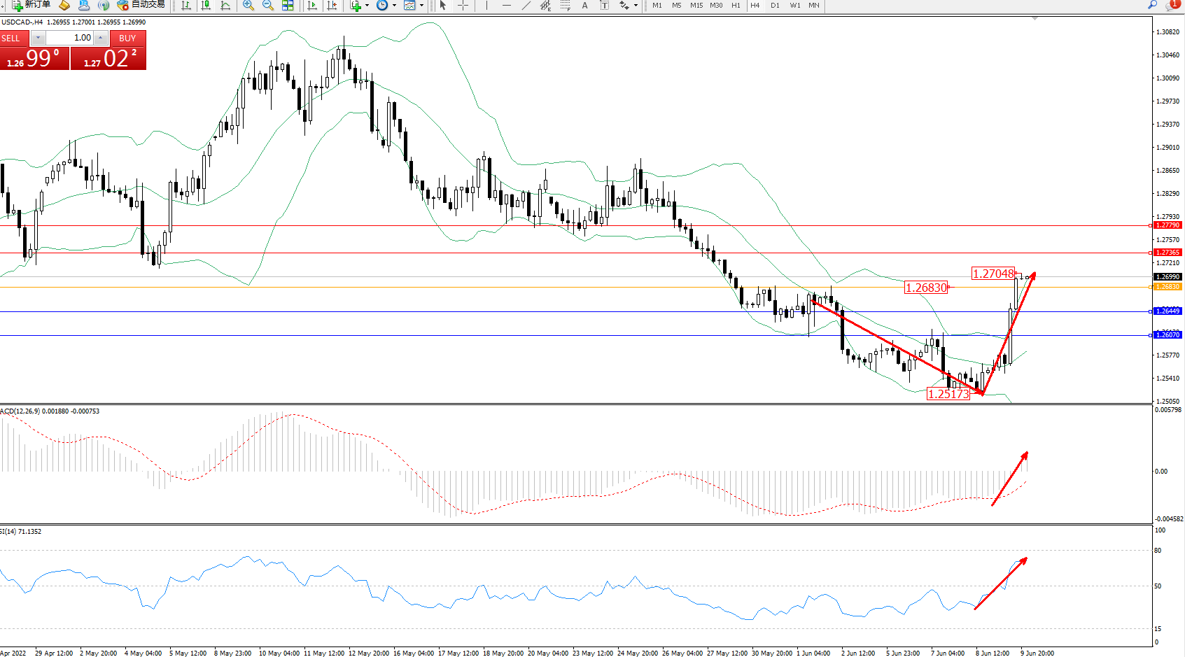 美元加元USDCAD——4小时K线图显示: