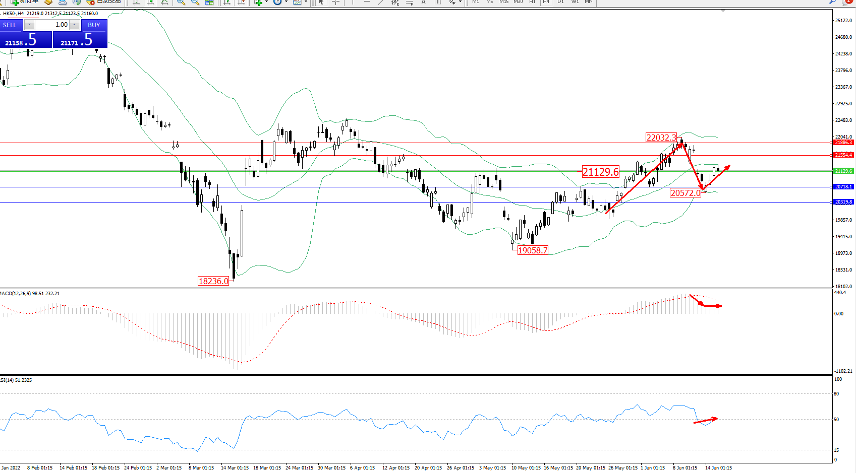 恒指HK50 ——4小时K线图显示: