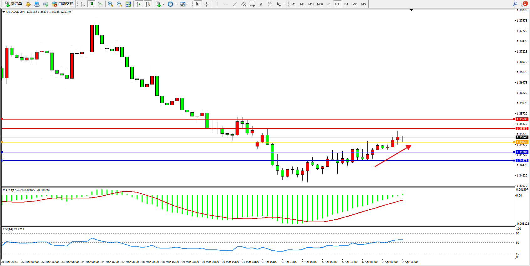 美元加元USDCAD——4小时K线图显示: