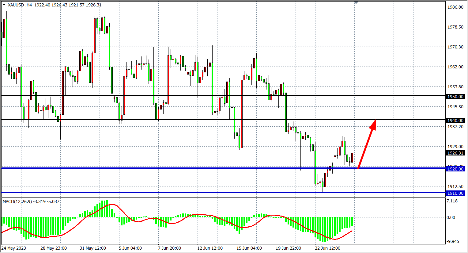 4小时图看,黄金一度反弹触及1930之上随后再度回落,MACD量能在零轴之下缩量,短线多头存在反弹空间,支撑关注1920-1910,阻力关注1940-1950附近。