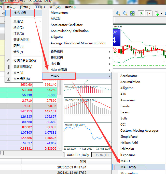 2.成功保存MACD双线指标后,登录MT4,点击插入菜单→【技术指标】→【自定义】→【MACD双线】
